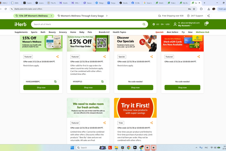 iHerb no siempre aplica los códigos de descuento automáticamente. Revisa los banners de la página principal, copia el código con la mano y pégalo en tu carrito antes de pagar para asegurarte de que se aplique el descuento.